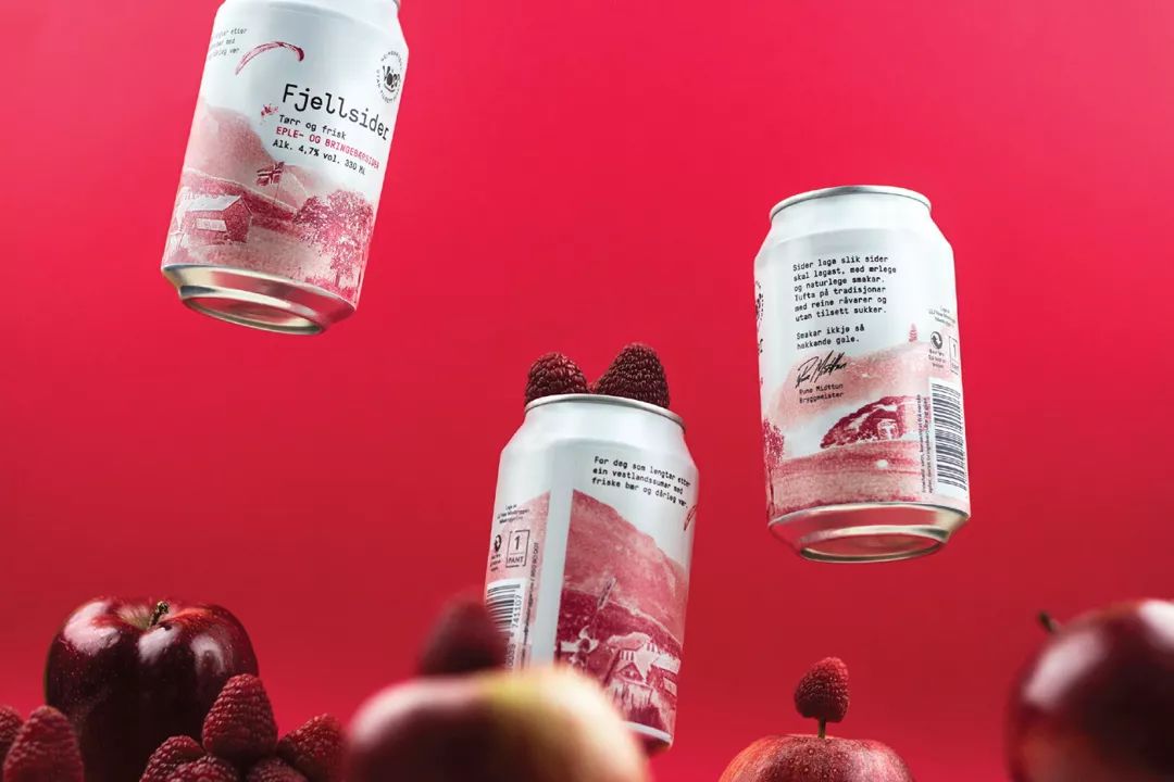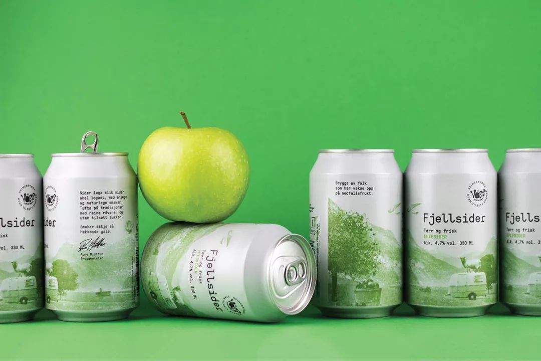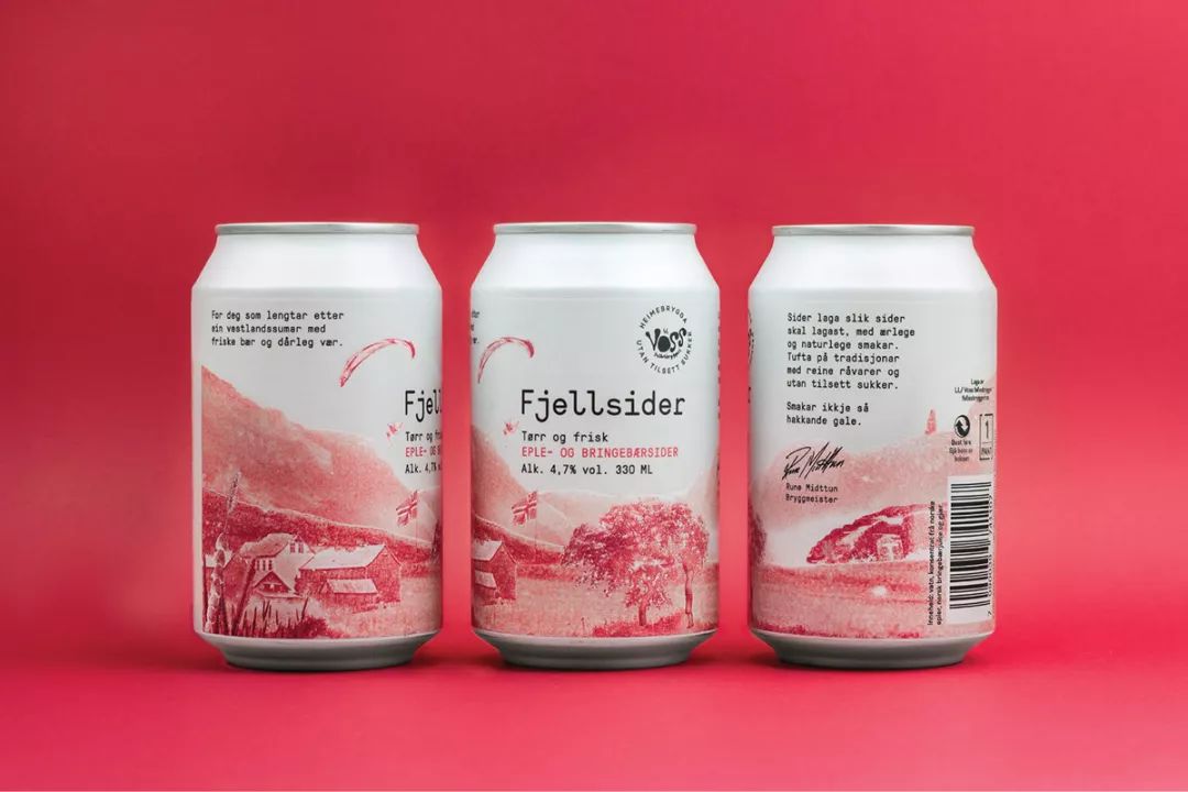 Voss Fjellsider 是一款蘋果酒品牌,挪威設計團隊為其設計的包裝,設計師為包裝繪出一組山間風景插畫,使用絲印的工藝制作而成,畫面以紅蘋果、青蘋果兩塊單色呈現,很好的呈現了酒與蘋果之間那種朦朧的感覺。