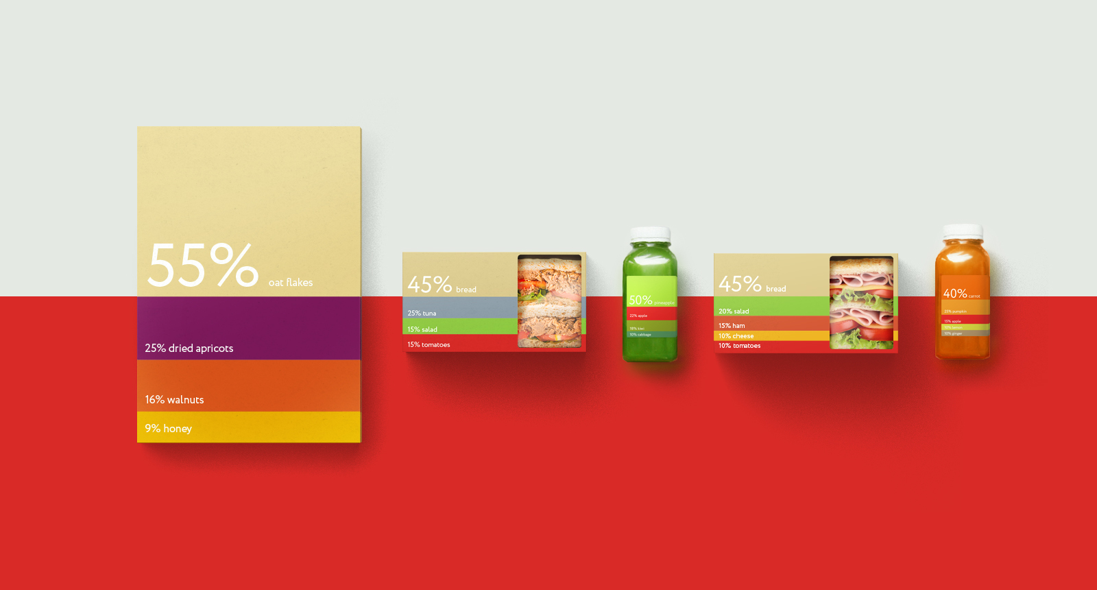 整體設計非常簡潔,大膽亮麗的色彩,在包裝上還標注了三明治中的營養成分,留白的“視覺窗口”將產品的原料展現在消費者眼前,給消費者創建了很好的觸覺體驗,使產品更加真材實料,給人留下一種奇特的心理感受。